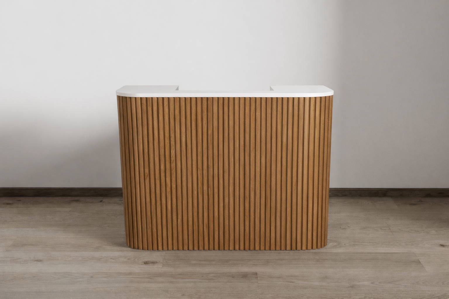 Elevate first impressions with Eden—our signature reception desk defined by square tambour detailing, and a refined, architectural presence. The softly rounded corners give it a modern, composed look that fits effortlessly in salons, studios, clinics, and design-forward offices.